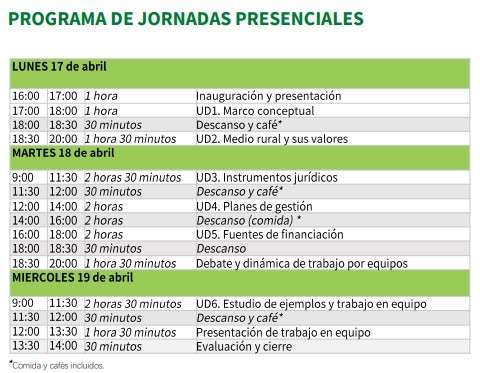 Esquema del evento: 30 h. en total (18 horas presenciales obligatorias los días 17, 18 y 19 de abril) y 12 horas online.