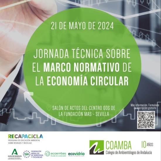 COAMBA organiza en el marco del Programa Recapacicla la Jornada Técnica sobre el marco normativo de la Economía Circular. Se trata de una actividad gratuita para fomentar el conocimiento en la transición hacia la Economía Circular en Andalucía, de interés para Estudiantes universitarios de los últimos cursos, recién titulados y titulados, así como Profesionales del Sector ambiental. Datos de interés:
