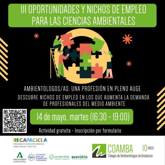 COAMBA organiza en el marco del Programa Recapacicla la III edición de la Jornada «Oportunidades y nichos de empleo para las Ciencias Ambientales». Se trata de una actividad gratuita para la mejora de la empleabilidad en la transición hacia la Economía Circular en Andalucía, destinada a todas las personas interesadas en descubrir los nichos de empleo y yacimientos laborales que pueden desempeñar los ambientólogos y las ambientólogas. Datos de interés: