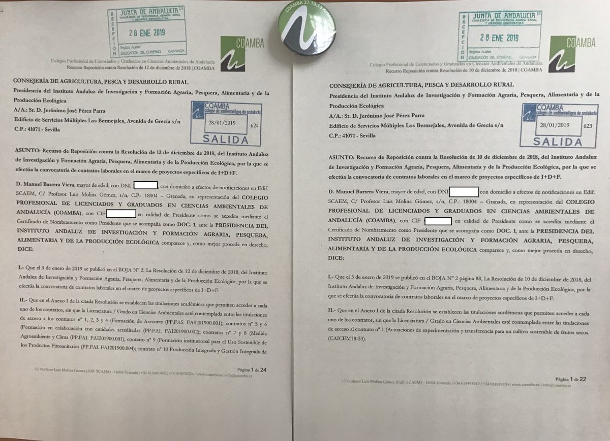 El pasado 28 de enero de 2019, presentamos dos nuevos recursos de reposición contra el Instituto Andaluz de Investigación y Formación Agraria, Pesquera, Alimentación y de la Producción Ecológica (IFAPA) perteneciente a la antigua Consejería de Agricultura, Pesca y Desarrollo Rural.