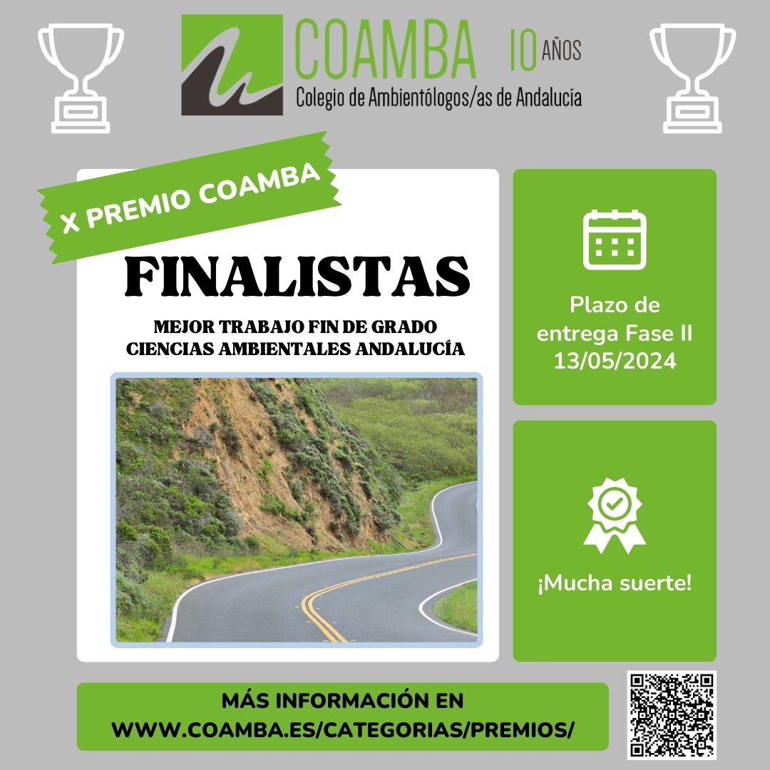 Tras recibir las candidaturas de la X Edición del Premio al Mejor Trabajo Fin de Grado en Ciencias Ambientales COAMBA realizado en universidades de Andalucía se han evaluado las que pasan a la Fase II, seleccionando los mejores trabajos, valorando su originalidad (metodología novedosa) y calidad del texto tanto expresiva como formal, así como los resultados obtenidos y la contribución de dicho proyecto a la sostenibilidad, protección y promoción del Medio Ambiente en Andalucía.