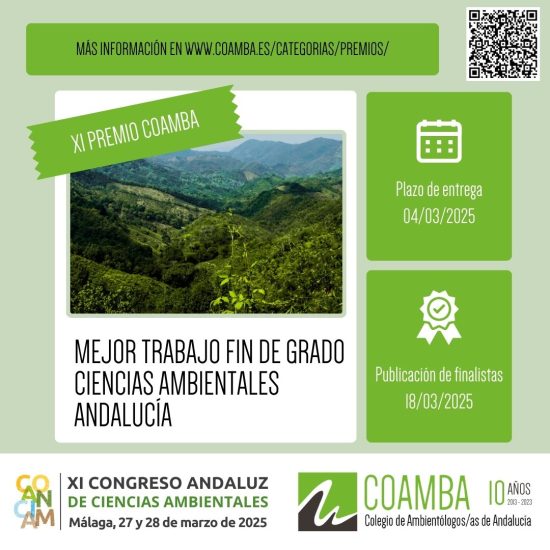 Tenemos el placer de convocar una nueva edición del Premios al Mejor Trabajo Fin de Grado en Ciencias Ambientales COAMBA realizado en universidades de Andalucía. Esta décimo primera edición se convoca por el Colegio Profesional de Licenciados y Graduados en Ciencias Ambientales de Andalucía (COAMBA), en su compromiso de velar por la excelencia académica en las distintas Universidades de Andalucía en las que se imparte el Grado en Ciencias Ambientales, y de estimular el esfuerzo en la calidad del Trabajo Fin de Grado (TFG) de los futuros profesionales.