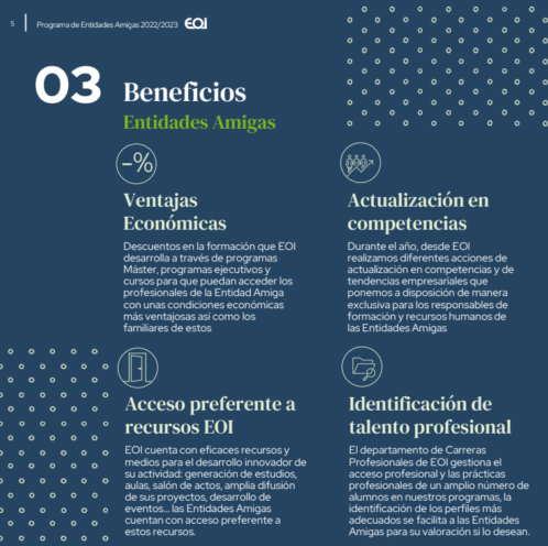 - Otras promociones: Durante el año se ofrecen diferentes promociones especiales que alcanzan el 40% de descuento en los programas de EOI y que están dirigidas exclusivamente a empleados de Entidades Amigas.