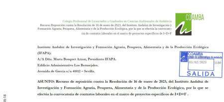 COAMBA presenta un nuevo recurso de reposición en defensa de la profesión de las personas tituladas en Ciencias Ambientales. El presente recurso va dirigido una vez más al Instituto Andaluz de Investigación y Formación Agraria, Pesquera, Alimentaria y de Producción Ecológica.