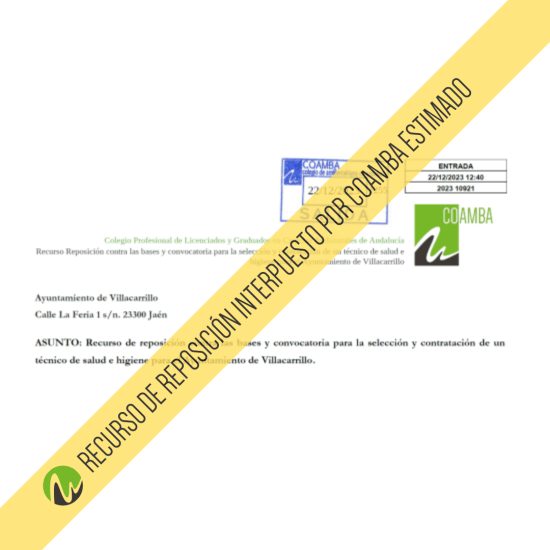 Gracias a la presentación de un recurso por parte de COAMBA ante el Ayuntamiento de Villacarrillo en Jaén, se han introducido cambios en las bases que regulan la convocatoria para la selección y contratación de un técnico de salud e higiene en dicho Ayuntamiento.