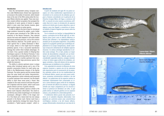 Con la intención de facilitar la disponibilidad de presas, a principios de los 90 del siglo XX, se introdujeron peces pasto como el alburno (Alburnus alburnus) para alimentar a los depredadores exóticos ansiados por los pescadores deportivos. Esta prolífica especie es un pequeño ciprínido que se distribuye ampliamente en la Europa transpirenaica, donde constituye la base de la alimentación de múltiples especies invasoras. Su exitosa estrategia reproductiva le confiere varias ventajas. Por un lado, produce un mayor número de descendientes comparado con sus homólogos de la península ibérica. Además, gracias a su considerable capacidad natatoria, consigue remontar y frezar en tramos aguas arriba de los embalses, con aguas corrientes, y fuera del alcance de las especies piscívoras que se establecen en los embalses.