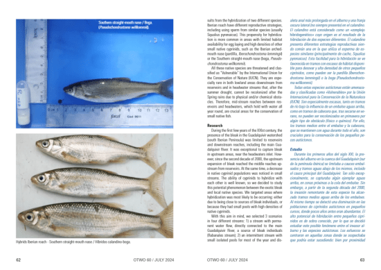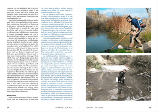 Los resultados genéticos mostraron que, en los tramos con pozas aisladas, altamente pobladas y parcialmente desconectados del cauce principal del Guadalquivir, se produce hibridación de calandino con otros pequeños ciprínidos autóctonos; mientras que en los tramos mejor conectados con el Guadalquivir se produce hibridación entre calandino y alburno. Además, se detectaron híbridos de calandino-boga (ambas especies nativas), procedentes de calandinos machos que fertilizan huevas de boga. Estos híbridos serían fácilmente reconocibles por su boca dispuesta a una altura intermedia entre ambas especies. Sin embargo, algunos individuos con apariencia de calandino «puro» fueron en realidad híbridos no reconocibles en base a características externas. Esto sugiere que se puede estar infravalorando la ocurrencia del proceso de hibridación y que, en algunos casos, los criterios morfológicos no son suficientes para distinguir híbridos. Estos resultados se derivan del estudio en un número limitado de cauces de agua; pero es precisamente esta facilidad para detectarlos lo que sugiere que la hibridación entre diferentes especies, autóctonas y no autóctonas, podría ser frecuente y estar extendida por la cuenca del Guadalquivir. Algunos de los cruces se sospechaban, pero han sido confirmados por primera vez en este estudio (ej. boga-calandino) y tienen especial relevancia para la conservación.