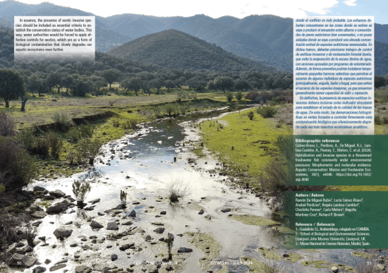 Ante este escenario, hacemos un llamamiento para insistir en la necesidad de coordinación entre las administraciones competentes en materia de cauces y biodiversidad, identificando aquellos tramos medios donde el conflicto es más probable. Los esfuerzos deberían concentrarse en las zonas donde se estime se vaya a producir el encuentro entre alburno y comunidades de peces autóctonos bien conservadas, o en pozas aisladas donde se vaya a producir una elevada concentración estival de especies autóctonas amenazadas. En dichos tramos, deberían priorizarse trabajos de control de exóticas invasoras y de restauración forestal riparia, que evita la evaporación de la escasa lámina de agua, con acciones apoyadas por programas de voluntariado. Además, de forma preventiva podrían instalarse temporalmente pequeñas barreras selectivas que permitan el ascenso de algunos individuos de especies autóctonas (principalmente, anguila, barbo y boga), pero que evitan el ascenso de las especies invasoras, ya que presentan generalmente menor capacidad de salto o reptación.