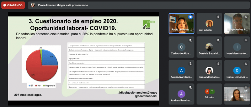 Hoy nos hemos conectado con el alumnado de primer curso de Ciencias Ambientales de la Universidad de Cádiz, concluyendo de esta forma nuestras Jornadas de Divulgación en las Universidades andaluzas donde se imparte el Grado. El objetivo es el de presentar nuestro colegio, la figura del ambientologo/a y motivar a los/as futuros/as ambientólogos y ambientólogas sobre las áreas de actividad que podemos desempeñar una vez finalizado el grado, tan necesarias en la actualidad debido a la crisis sanitaria, económica y ambiental en la que nos encontramos.