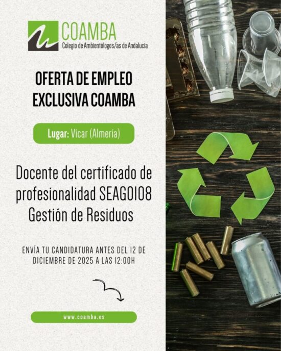 Oferta de empleo exclusiva para colegiados/as 2025_74: Docente del certificado de profesionalidad SEAG0108 Gestión de Residuos