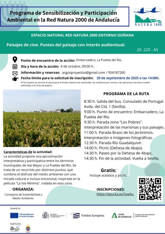 Programa de Sensibilización y Participación Ambiental en la Red Natura 2000 de Andalucía 30 septiembre 2025 Fecha: 4 de octubre, 9 horas.Lugar: Embarcadero, La Puebla del Río.Fuente: Consejería de Sostenibilidad y Medio Ambiente.