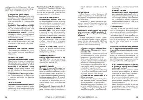 CSRD (Directiva de reporting en sostenibilidad): Obliga a las empresas a implementar un sistema estandarizado de reporting basado en la doble materialidad. - Directiva contra el Greenwashing: Establece normas para evitar prácticas engañosas y garantizar información clara sobre sostenibilidad.