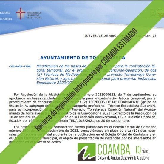 Estimado el recurso presentado por COAMBA frente a la Resolución por la que se aprobó la convocatoria y las bases para la contratación laboral temporal de dos técnicos de medio ambiente.