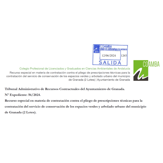 COAMBA presenta un recurso especial en materia de contratación contra el pliego de prescripciones técnicas para la contratación del servicio de conservación de los espacios verdes y arbolado urbano del municipio de Granada (2 Lotes).