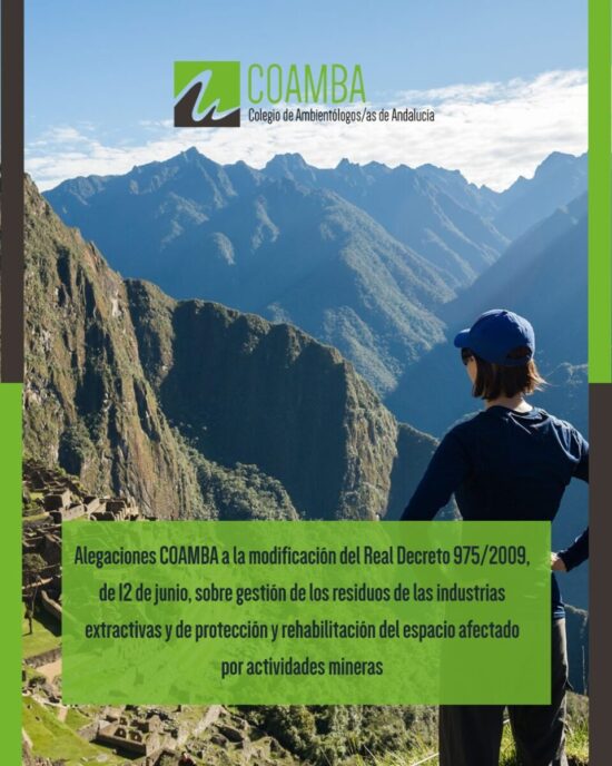 El Colegio Profesional de Ambientólogos y Ambientólogas de Andalucía (COAMBA) ha presentado alegaciones en el proceso de participación pública abierto por el Ministerio para la Transición Ecológica y el Reto Demográfico (MITECO) sobre la modificación del Real Decreto 975/2009, por el que se regulan la gestión de los residuos de las industrias extractivas y la protección y rehabilitación del espacio afectado por actividades mineras.