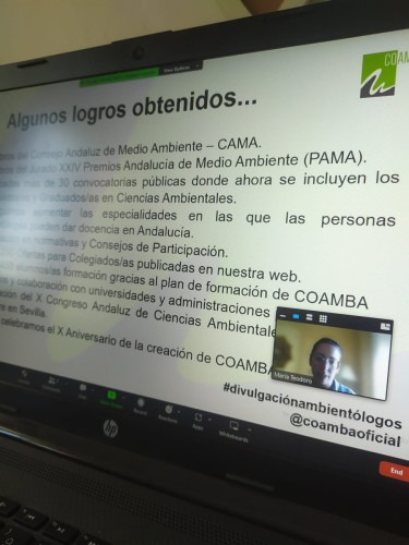 El pasado jueves 4 de mayo, la Representante Provincial de Huelva, María Teodoro Gómez, estuvo conectada de forma telemática para motivar a los/as estudiantes de cuarto curso de la Universidad de Huelva respecto a las salidas profesionales de nuestro perfil como Ambientólogos y Ambientólogas.