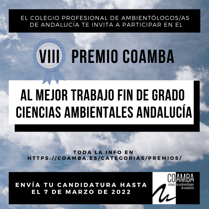 Tenemos el placer de convocar, un año más, la VIII Edición de los Premios al Mejor Trabajo Fin de Grado en Ciencias Ambientales COAMBA realizado en universidades de Andalucía. Esta nueva edición del Premio se convoca por el Colegio Profesional de Licenciados y Graduados en Ciencias Ambientales de Andalucía (COAMBA), en su compromiso de velar por la excelencia académica en las distintas Universidades de Andalucía en las que se imparte el Grado en Ciencias Ambientales, y de estimular el esfuerzo en la calidad del Trabajo Fin de Grado (TFG) de los futuros profesionales.