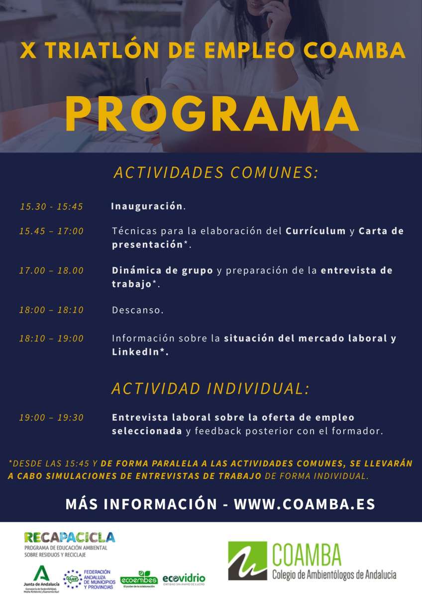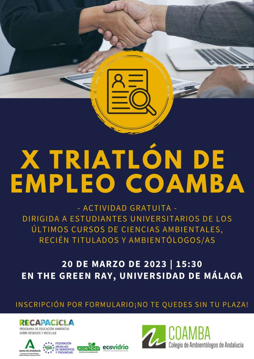 Lanzamos una nueva Edición del Triatlón de Empleo COAMBA, en el marco del Programa Recapacicla. Esta actividad es gratuita, está dirigida a Estudiantes universitarios de los últimos cursos de Ciencias Ambientales, recién titulados y Ambientólogos/as. Datos de interés: